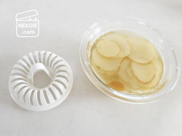 今日はチップスメーカーでおやつをつくりました。ジャガイモをスライスして、専用スタンドに立ててレンチンする、という道具です。