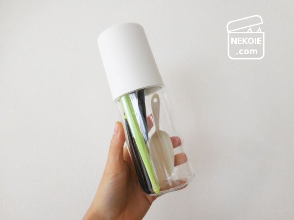 このケースはドリンク用のボトルとは違い、蓋にも高さがあるのが特徴。本来の用途であるペンはもちろん、私が重宝しているカトラリーなど、長さがあるものを収めておいても取り出しやすくなっています。