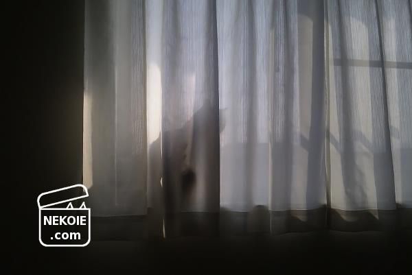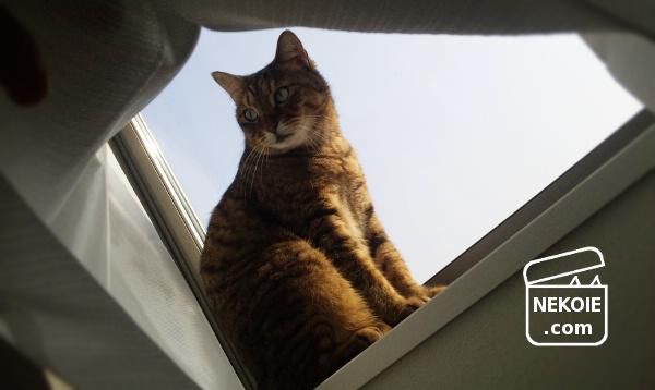サッシを掃除した窓辺にたたずむ、日暮れ時の猫。