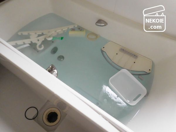 そのまま粉末を投入すると溶け残ることがあるので、洗面器で溶かしてから入れ、その洗面器も一緒に浸けました。その他、浴室内で外せそうな小物(アルミ製品を除く)をまとめて。