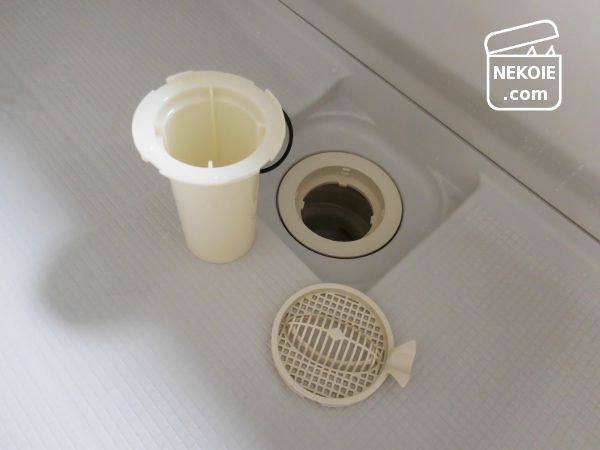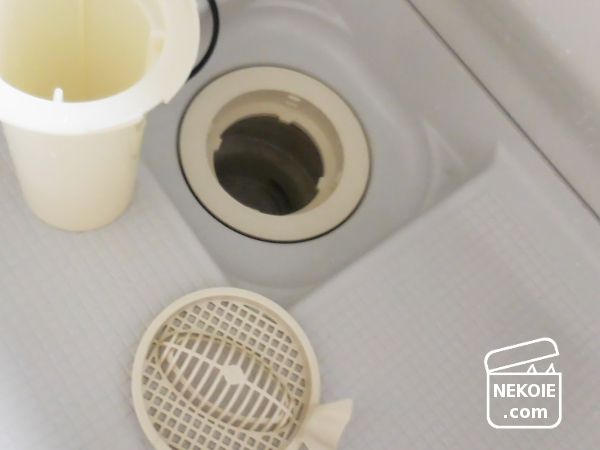 事前に洗っておいた排水口のパーツも一緒に浸け置きました。こちらはメッシュ部分だけ毎日、内部のパーツも毎月洗っているので、さほどひどい汚れではないかなと。