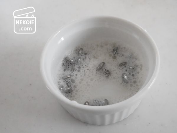 いつもは水洗いだけのネジは、初めて石けん(泡)で包み浸け。どんな金属でも長時間アルカリに晒すと錆びやすくなるそうなので、10分ほどを目安にしました。