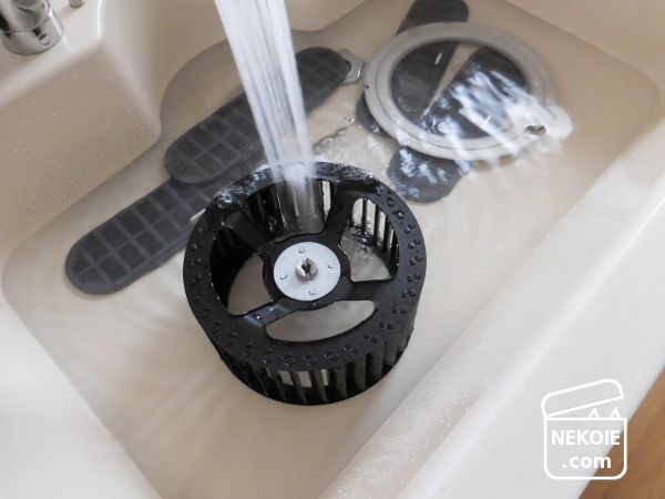 換気扇はすべて分解して、シロッコファンなどを洗いました。今回シンクに水をためるのはこの方法で。