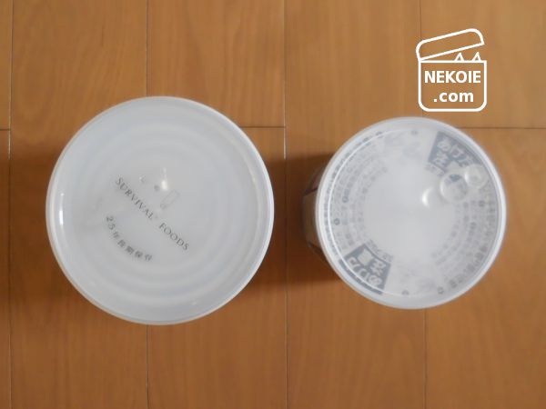 こういう長期保存缶にはさびの発生を抑える処置をされたものが多いようだけれど、それでもちょっと心配でした。設置場所には紙や食器棚シートなどを敷くようにしていたけれど、この蓋が上下ともにはまると気づいてからは古いほうも処分せず使うようになったんです。