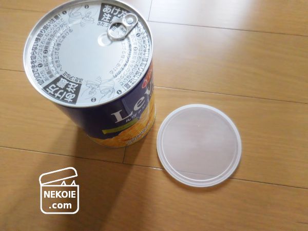 従来品の蓋は一回り小さいので、新しい缶の下に置いているだけです。