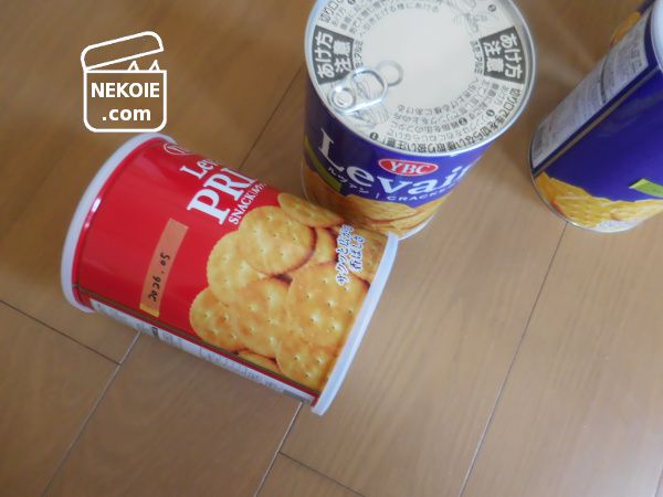 ちなみに新入りのクラッカー缶も重ねることが可能でしたが、一つ1kgを超える重さなのであまり積まないほうが安全そうです。