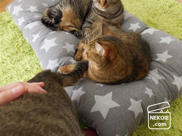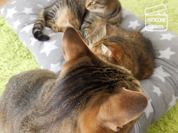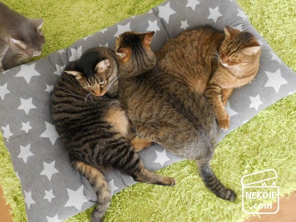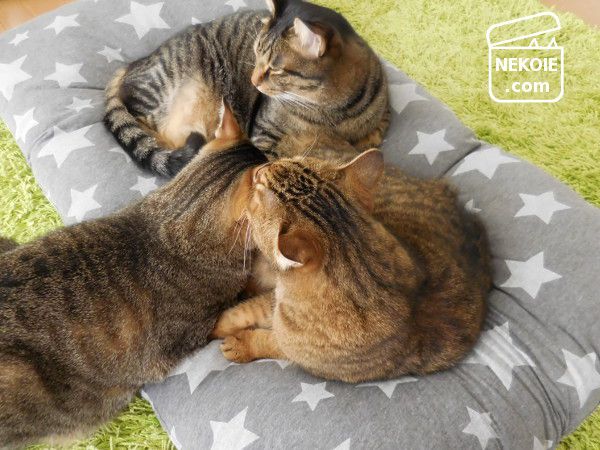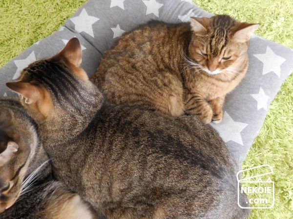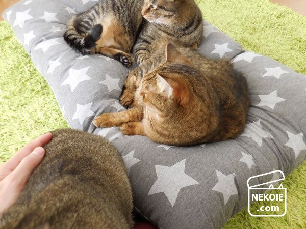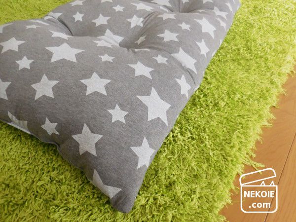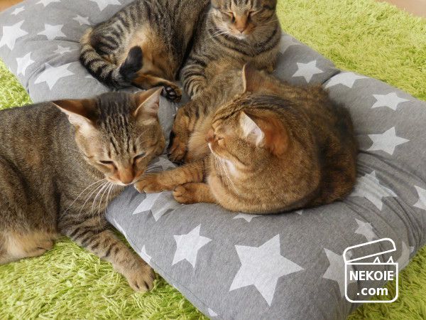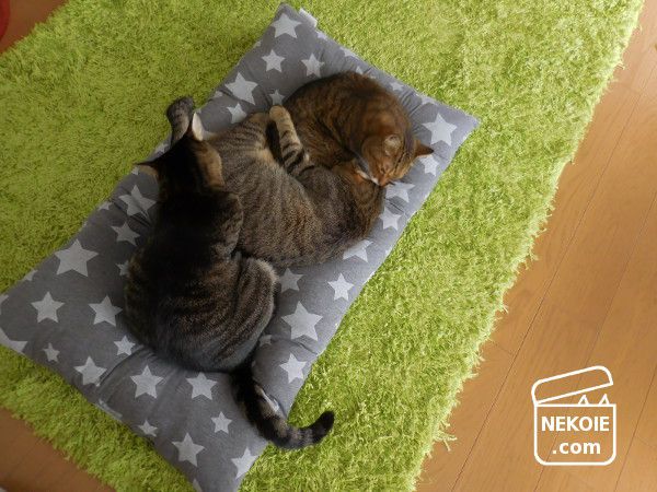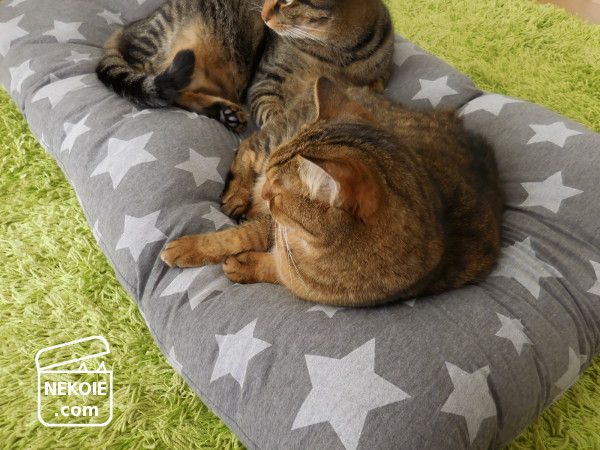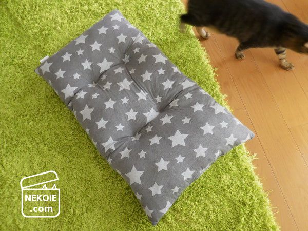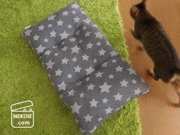 どうせ隠れてしまうからと柄選びもちょっと冒険した星柄。うちのリビングで見ると若干違和感を覚えるのですが(でも星柄は好きです)…どことなく猫たちの雰囲気までコミカルに。