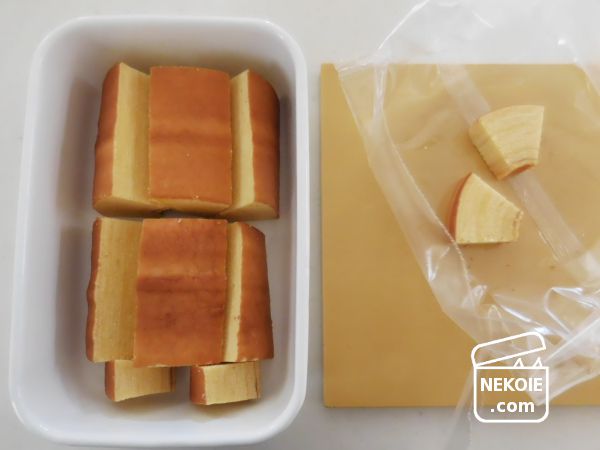 八等分サイズでは入りきらなかったぶんは、更に一口大まで切り分けて。