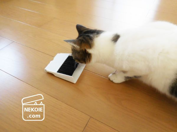 用途を考えれば獣毛である必要性はないし、しゅろほうきなどの植物素材だとうちの猫はかじってしまう可能性があり、出しっぱなしにできません。見た目や香りが猫草っぽい(自然のものっぽい?)ため、興味を持ってしまうのだと思う。そのため、積極的に樹脂製のほうきをさがしました。