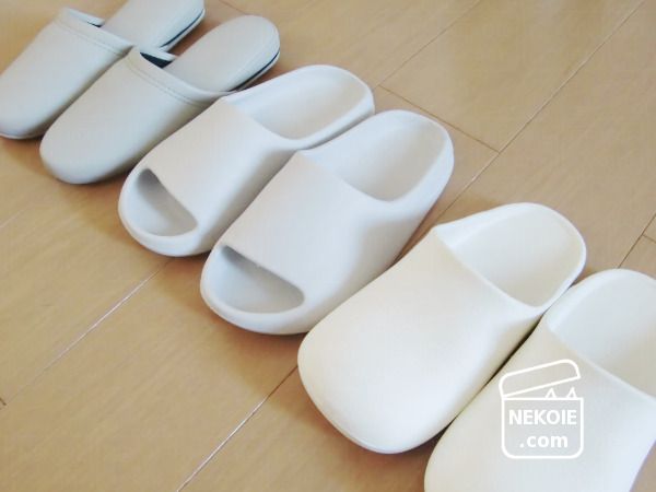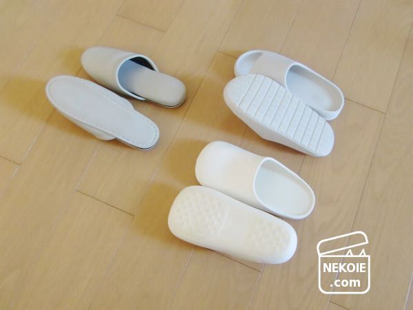 布製品と違って洗っても傷むことはほとんどないし、今のところ落ちない汚れもありません。そうなると心置きなく真っ白スリッパを選ぶこともできるため、インテリア面でも嬉しいという結果に。