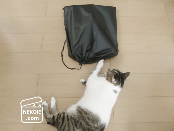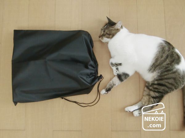 本日の猫は、防災用トイレ(収納袋)と一緒に。