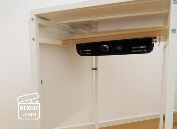 ヒーターは高熱になるので、テーブルの天板裏に直接取りつけるのは避けました。たわんでしまったり、ひどければ火災の原因にもなりかねないと感じたため。棚板を挟むことでテーブル本体への負担は軽減しているかなと思います。