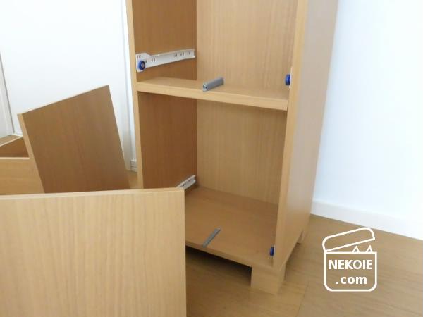 全部「板」の状態に戻したかったのですが、いくつかネジ穴をつぶしてしまったので、頭の中で完成図を修正しながら作業進行。中板を一つ外し、最下段の引出しだけは残すことに。