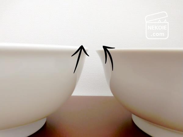 ただ旧どんぶり(右)は上に向かって広がっているデザインなので、満水量に大差はありません。古いほうはハッキリわからないのですが、新しいほうの満水量は「870cc」との記載があります。