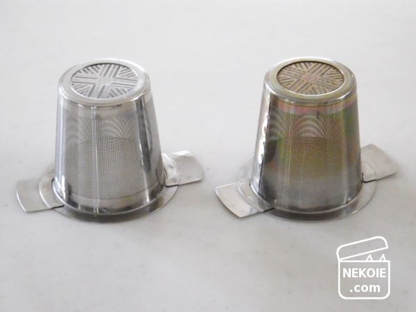 ティーストレーナーはマグカップで使うため、家族の人数分あります。この二つは同じくらい汚れ(茶渋&虹色化)ていましたが、今はすべてピカピカに。ビフォーアフターのように二つ並べてみました。