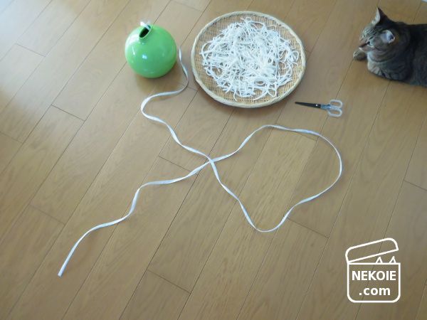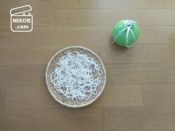 用意するのは、盆ザルと、ビニール紐。いつもダンボールをまとめるのに使っている、100円ショップなどでも手に入る紐です。