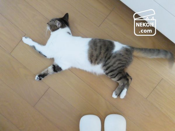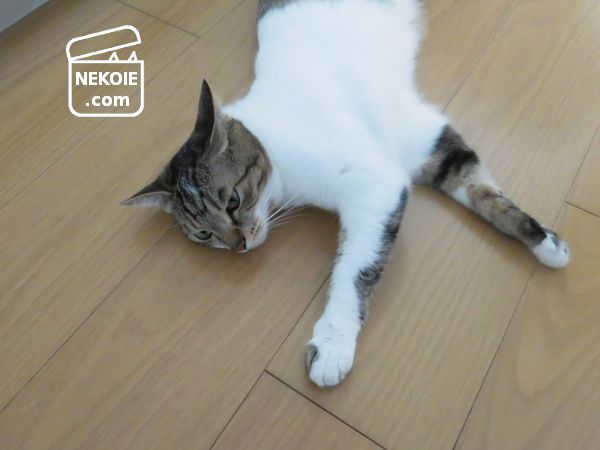 家の床は大半がフローリングなのに、彼のお気に入りはキッチンのよう。冷蔵庫の近くであること、水回りであることなどが関係しているのでしょうか?