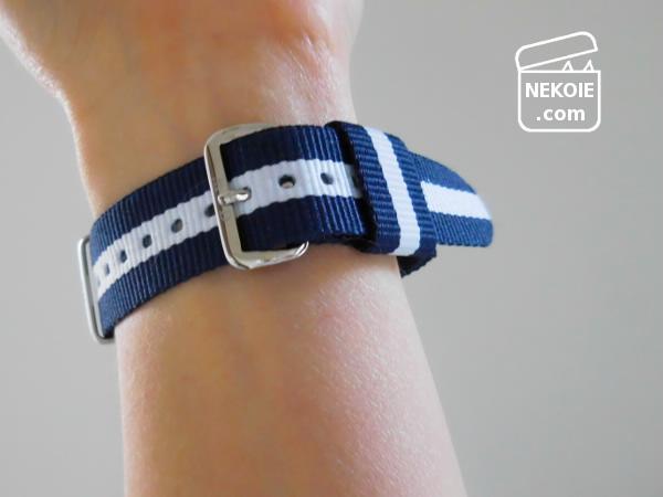 NATOストラップはいずれも三本線のストライプ。過去にこういうデザインに挑戦したことはなかったのですが、今回は「夏によさそう!白シャツに合いそう!」というインスピレーションでブルーとホワイトの二色タイプに決定です。