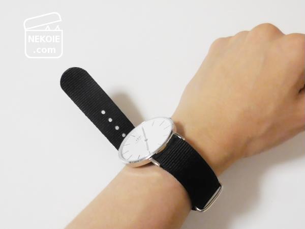 こちらは同じNATO素材の単色ブラックベルト。これからの季節、このほうが私の手持ちの服には合わせやすいかなと。また汚れも気にならないので、定期的に洗うくらいでよさそうです。