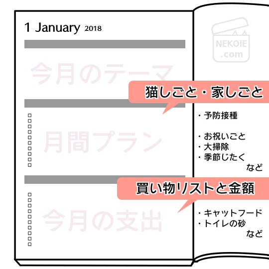 「ねこ手帳」と呼ぶからには「猫のことだけ」と思ったのですが、私にとってはまとめて「家族のこと」なので、ここには家しごとについても書き入れることにしました。
