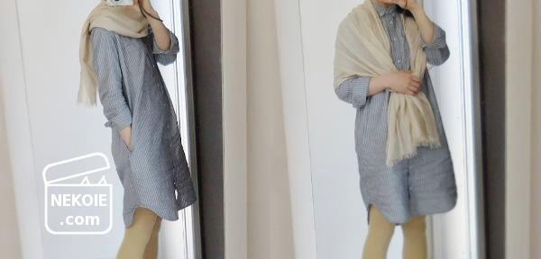 私服の制服化にシャツワンピを取り入れたとき、「一枚でサラリと着られること」を意識した筈ですが、雰囲気的にちょっと寂しいとき、まだすこし寒いなと感じたときに足すアイテムとして、ガーゼストール(何年か前に無印良品で購入)を愛用しています。