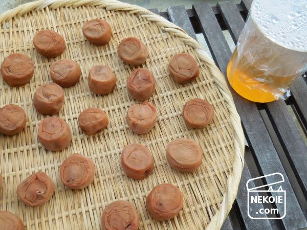 干し始めたのは日曜日。毎年悩むのだけれど、「三日三晩」というからには四日目に回収するのが正解かな?という感覚で、干し終えたのは水曜日の昼前。並べてあった梅酢の瓶(今年は計量カップ)もいっしょに取りこみました。