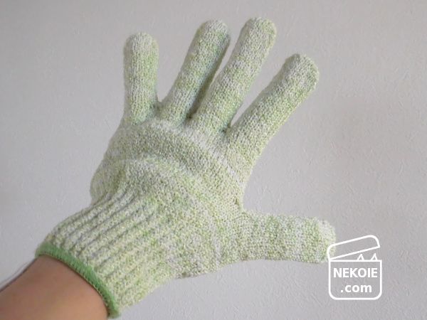 と思っていたのですが、最近は腕も脚もこれで撫でるように洗っています。手袋を装着し、その状態で石けんを泡立てて体を洗う。その流れがとても楽で。