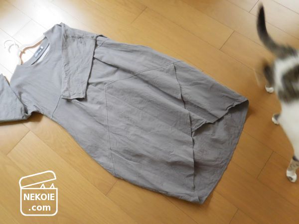 色はグレー(チャコール)。実はパーソナルカラー診断を受ける前に手に入れたもので、そういう意味ではちょっと失敗カラーだったのですが、着心地や「対子猫」の用途ではなかなかよかったのです。