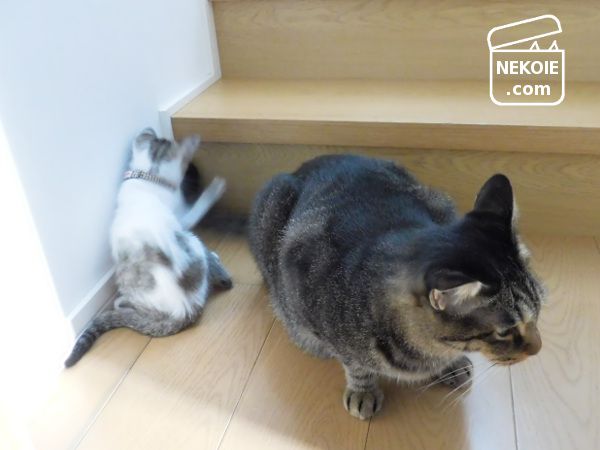 追いかけっこ中、お兄ちゃんたちにつられて突進している姿を見て「子猫が転がり落ちてる!!???」と焦ったのですが、ちゃんと地に足をつけた状態で駆け下りて、無事に一階の床に着地(?)。その後もケロリとしている新入りを、すごい!すごい!と褒めまくりました。