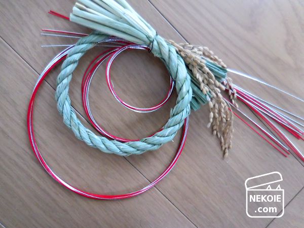 そして別途用意しておいた、しめ縄飾り用のリース土台も飾りつけ。