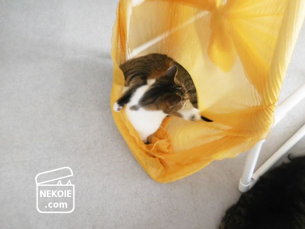 メインで飛びかかっているのは弟猫だけれど、兄猫たちもこの布を大好きな様子。多くの猫たちがこれに惹かれる理由が未だにわかりませんが、好かれているのは嬉しいことです。