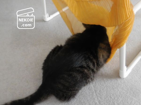 この生地はもともと私の衣類のはずでしたが、すっかり猫に気に入られてしまい、現在も飽きることなく堪能されているらしいおもちゃ(?)の一つ。