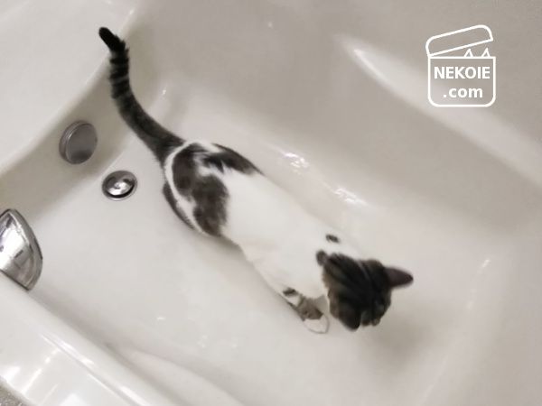 お湯を抜いている最中のバスタブに、たじろぐことなく侵入していくのが彼の日課。そしてとうとう、この状態。