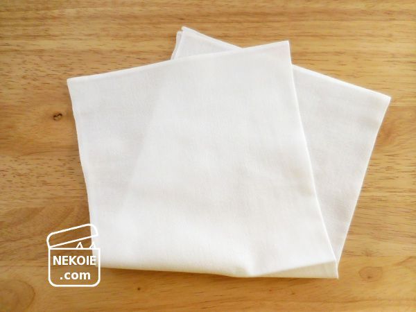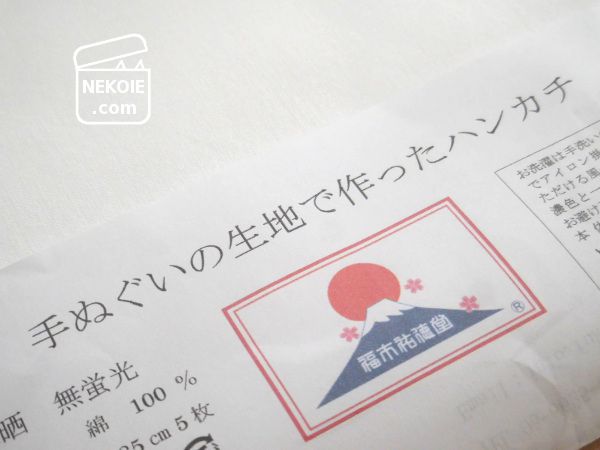 手ぬぐいといっても、一般的な長いものではなくて、はんかちサイズにカットされたもの。正方形のさらし、とも呼べるかもしれません。色柄もなし。だったら、さらしで自作することも考えましたが、今回は端が処理されているものがほしくて既製品を買いました。