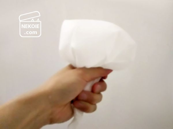- 真ん中に少し空気が入った状態で、四隅からまとめつつ湯の中に沈める。