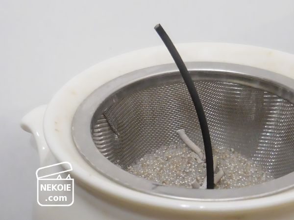 燃えにくさについては湿気が原因となることを実感していました。ただ真ん中あたりで折ったとはいえ、もとは一本のお線香。片方はきちんと燃え尽きたというのに、その半分がこんな残り方をするのが不思議だなと。