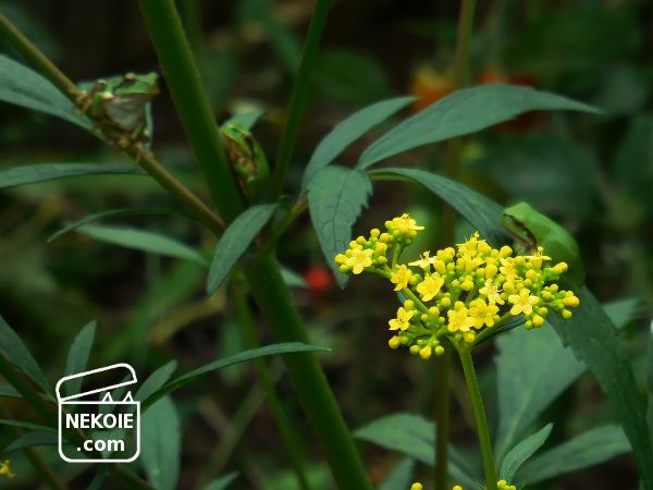 実は開花後のオミナエシには、もう少し大きめの写真があるのですが、「カエル」も大きめに、しかも複数写りこんでしまったので、苦手な方はここで画面を閉じていただくか、一枚飛ばして次に進んでください。
