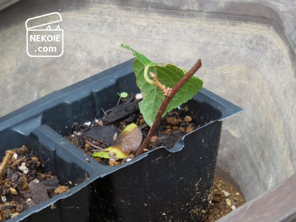そういえば根づいた、根づいたと文字ばかりのご報告になっていた、マタタビの挿し木がこちら。