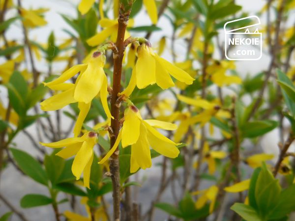 レンギョウは今年も鉢植えで育てています。こんもりと枝が茂り、2~3cmの花がいくつもつきます。