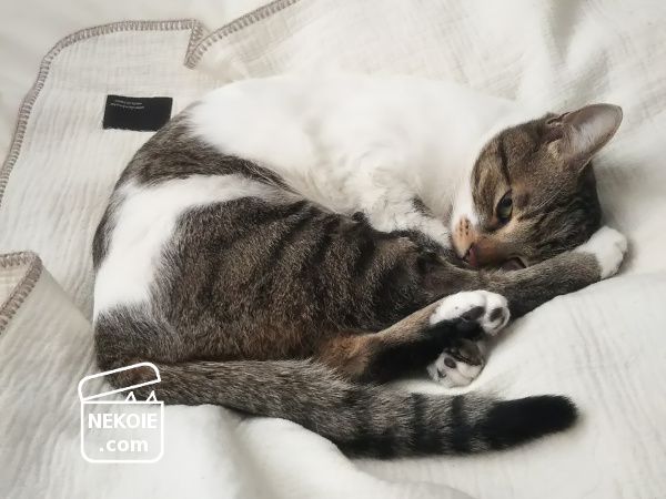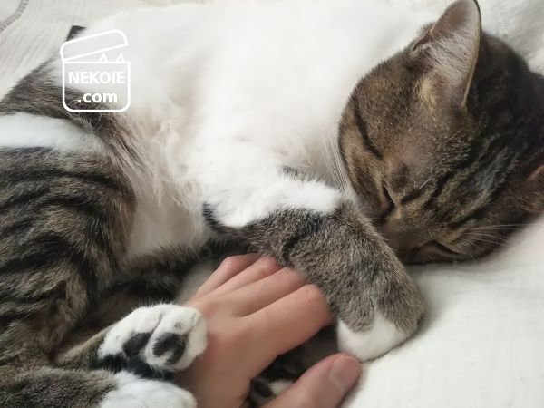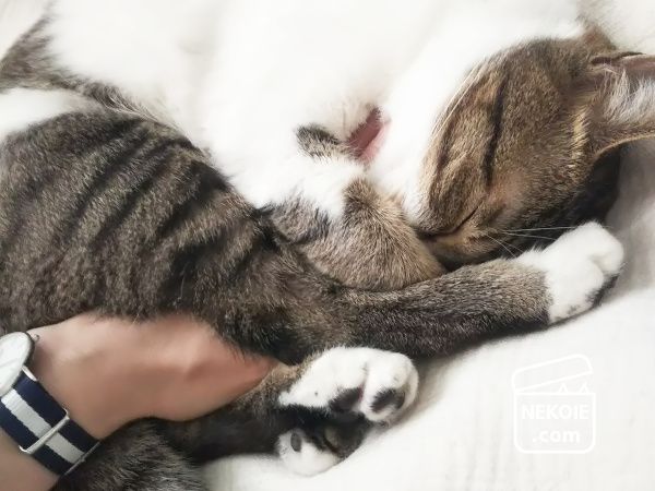 もとい、いつまでも寝たふりを続けようと画策する猫(目が開いている)。