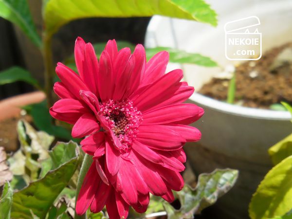 今年もわが家の庭で(でも鉢植えで)、ガーベラが咲きました。最近知ったのですが「ガーデンガーベラ」という一般家庭向けの品種のようです。