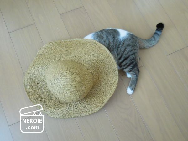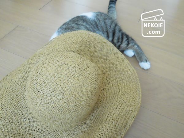 これ、彼が自分で引っ張り出してきた帽子です。かぶせたのは私ですが、嫌がる様子もなくしばらくこの状態を楽しんで(?)いました。