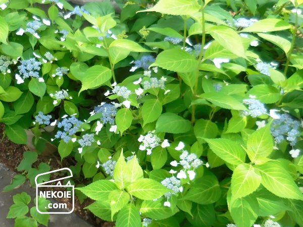 他にもブルーやピンクのアジサイがあるのですが、こちらの額の形はオタフクアジサイと呼ばれるものかと。本当にどれもとてもかわいい、梅雨の庭のいろどりです。