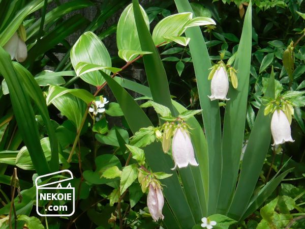 アジサイやアガパンサスは腰や胸の高さなのでぱっと視界に入るのですが、その足元でひっそり咲くのがホタルブクロ。