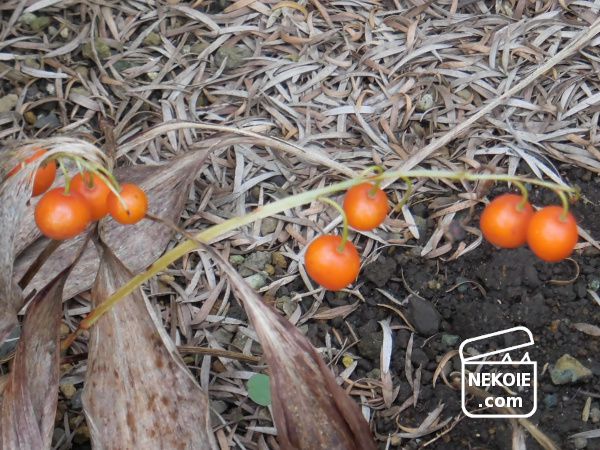 わが家の庭には他にも数ヶ所に同種のスズランがあるのですが、実がついたのは一ヶ所だけ。花期の後に必ずしも結実するわけではないようで、その実も途中で腐って落ちてしまう様子を数年前から見てきました。