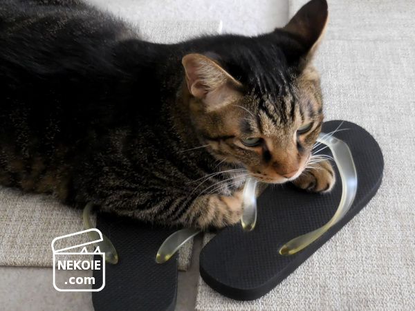 数年前に購入してベランダ用(予備)にしていたビーチサンダル。洗って干しておいたはずが、いつの間にか猫が温めて(?)くれていました。