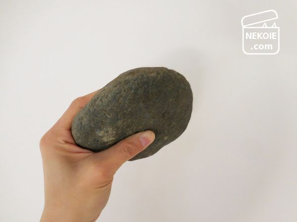 このつけもの石、こんなに薄くて小さいのに、およそ1kg。ごらんのとおり手になじみ、実際に重石として使うときにも大変扱いやすかったです。