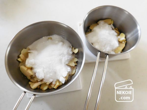 実は「りんごを買ったんだけどおいしくなかった、どうにかして」(!)と知人から譲り受けた果実でして、若干傷んだ部分を取り除いていたらこちらも細切れ状態に。仕上がりがどうなるかわかりませんが、こちらもおいしく食べられたらいいなと念じながら煮詰めました。