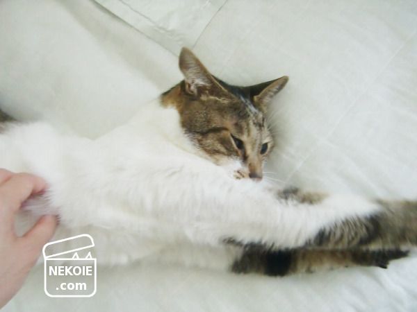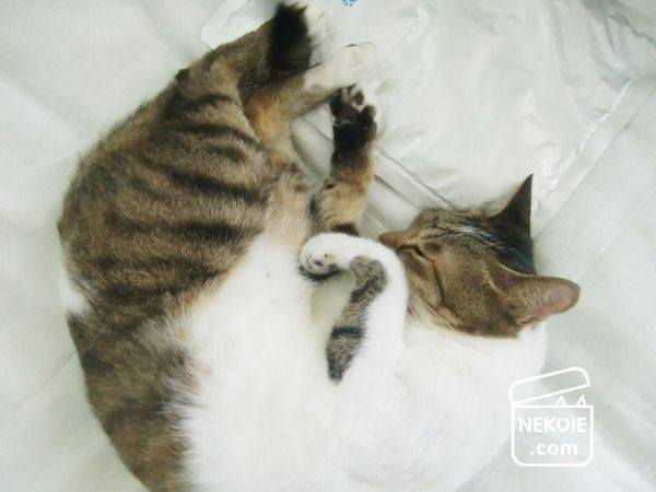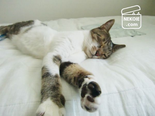 夜間はベッドの半分ずつを私と弟猫でシェアしていますが、日中はその中央で独りぐっすりの弟猫。