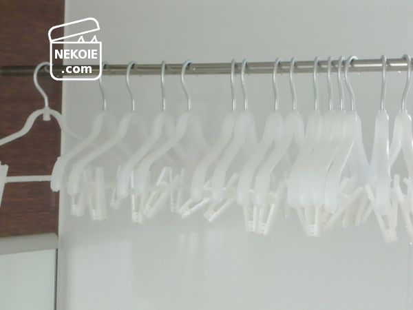 浴室干しで使うハンガー類は樹脂製が中心。でも紫外線にさらされないのでほとんど劣化を感じません。ただしかびなどの心配はあるため、一年に一度は漂白剤に浸け置きするようになりました。